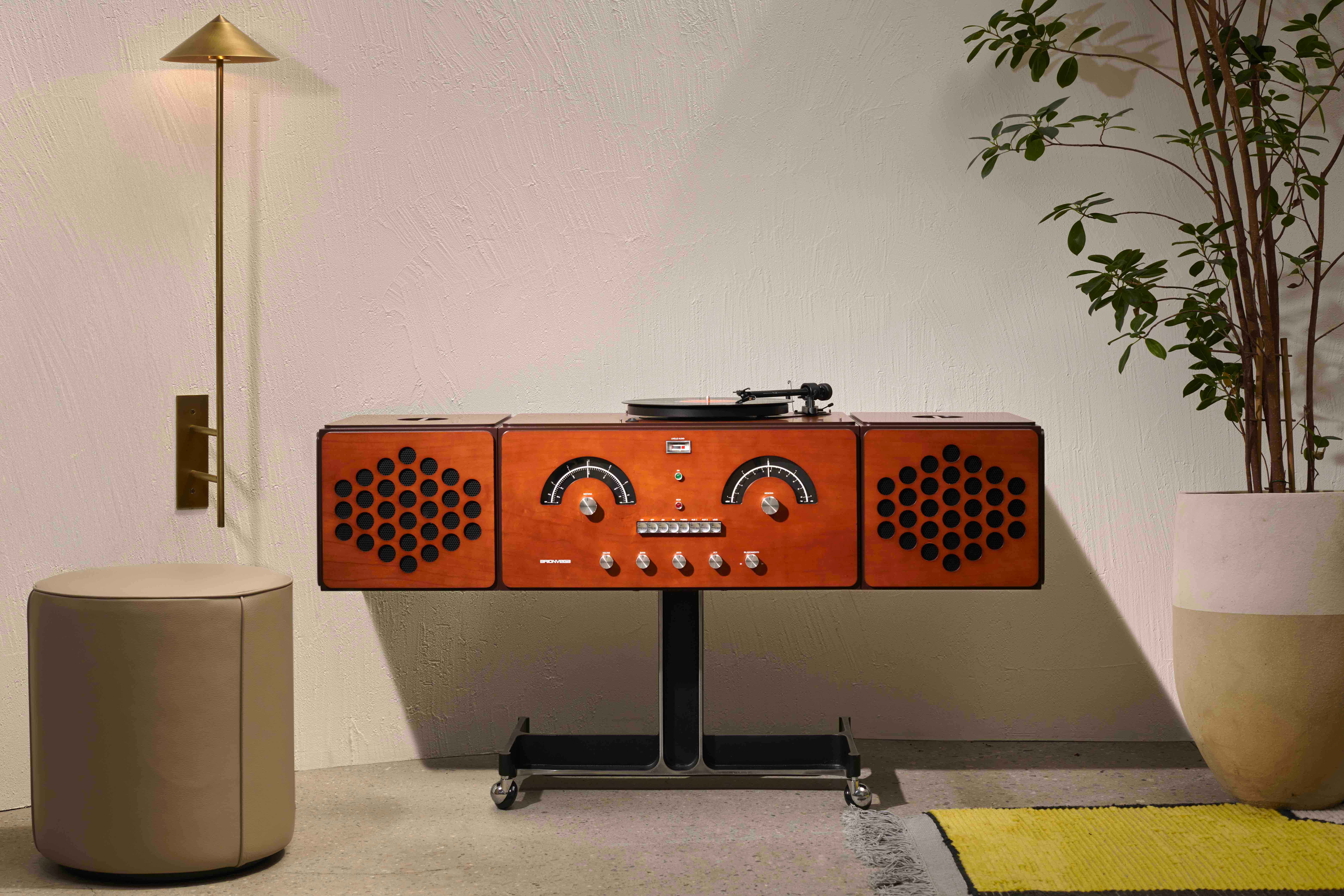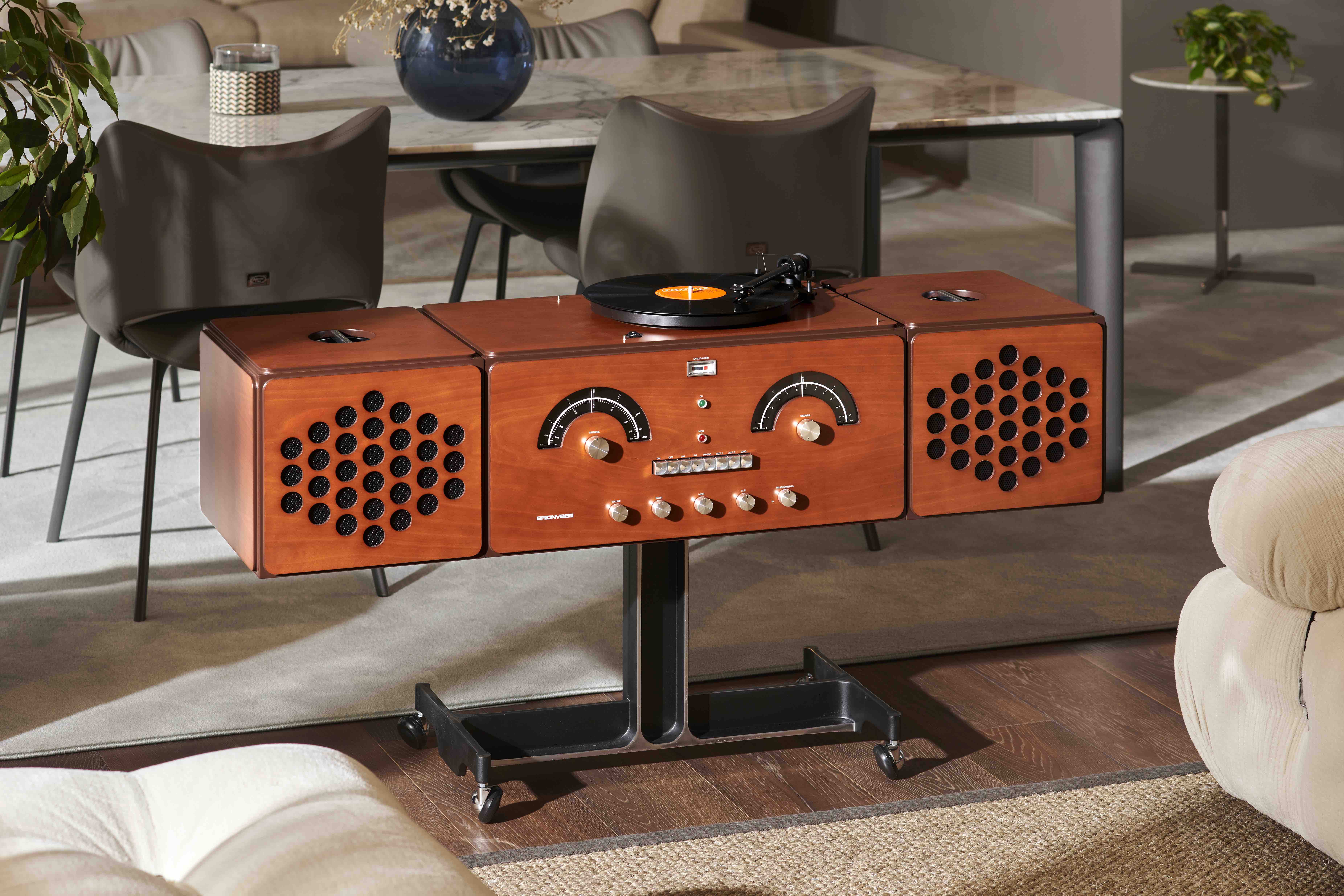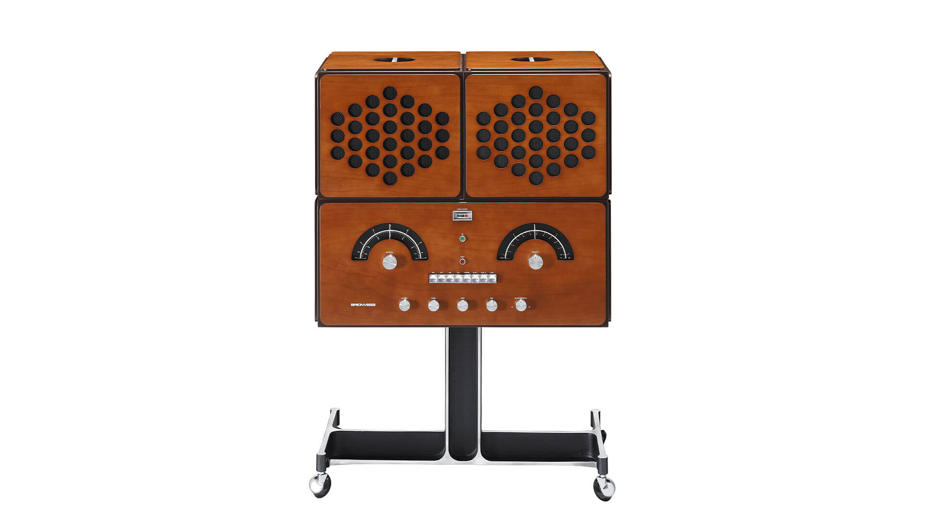 La coexistencia de estos dos aspectos tan diferentes: la robustez de la madera y la delicadeza de su floración, rinden homenaje a la doble naturaleza del clásico radiofonografo Brionvega: una Pieza de Arte de gran fiabilidad acústica contenida en un diseño de la más alta elegancia y forma plástica.