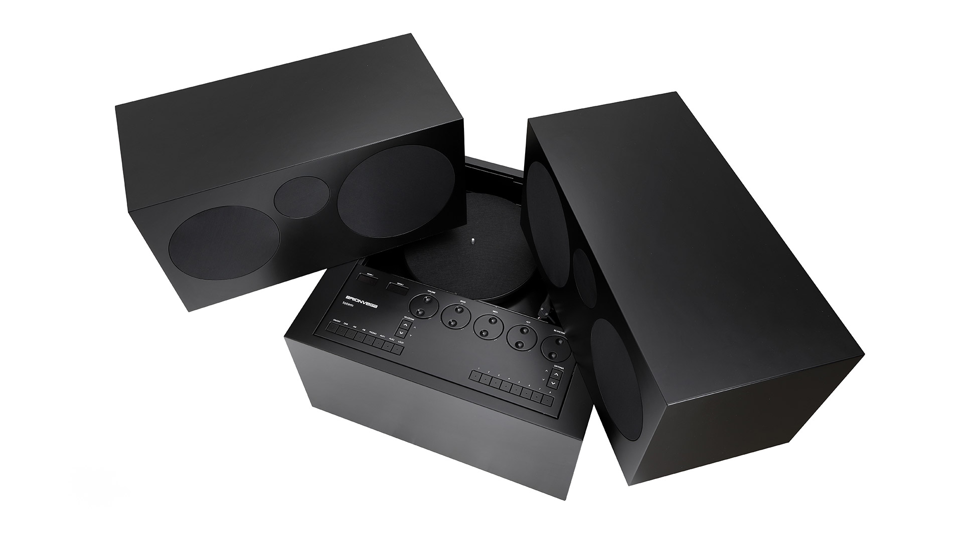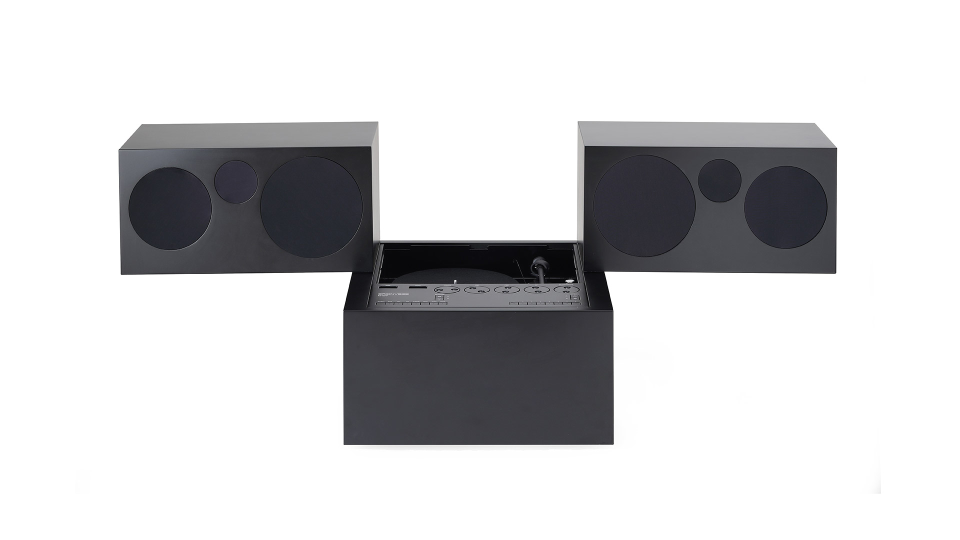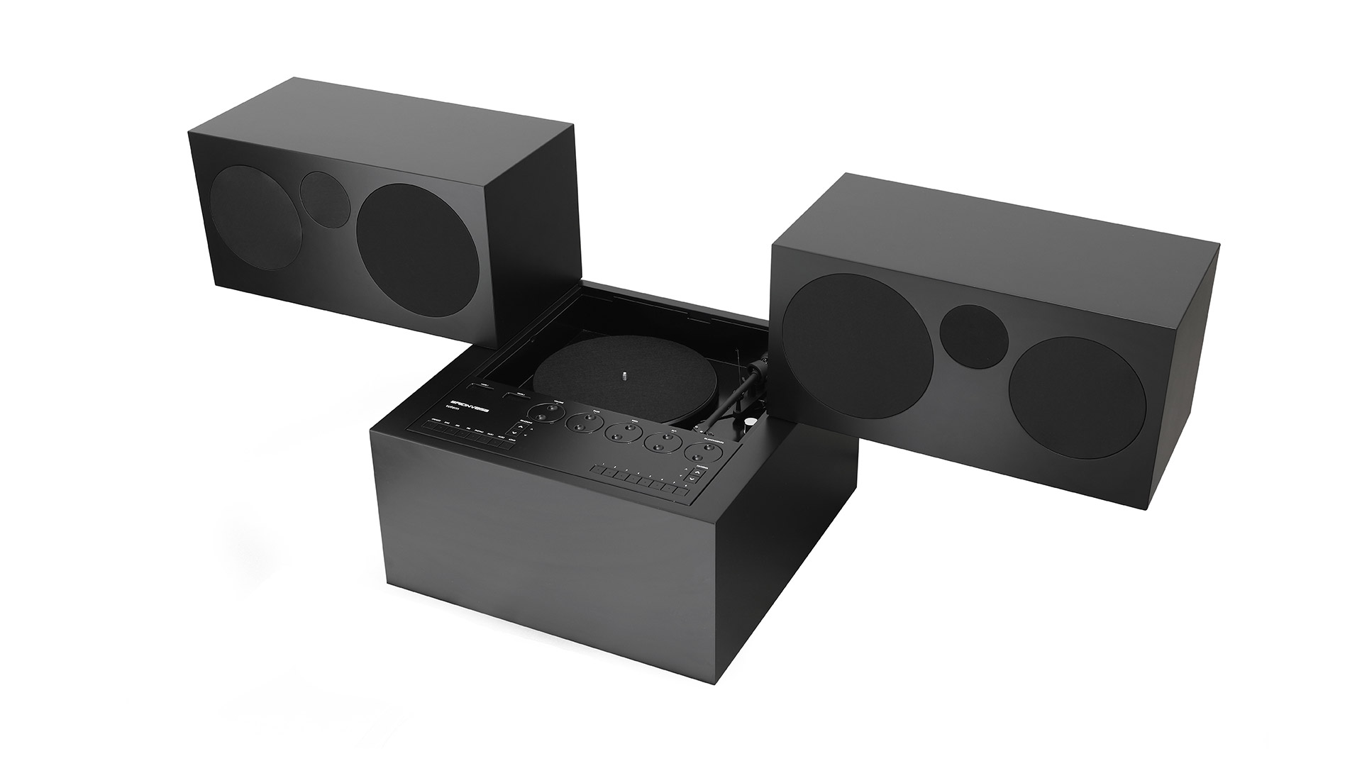 A simple cuboid that opens up and is reconfigured in a sophisticated Hi-Fi listening machine with two speakers that open to reveal the stereo module, radio and turntable.